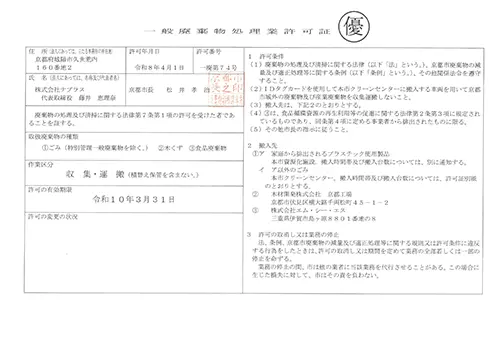 京都市より引き続き「一般廃棄物 収集運搬業 優良事業者」として、認定いただきました。